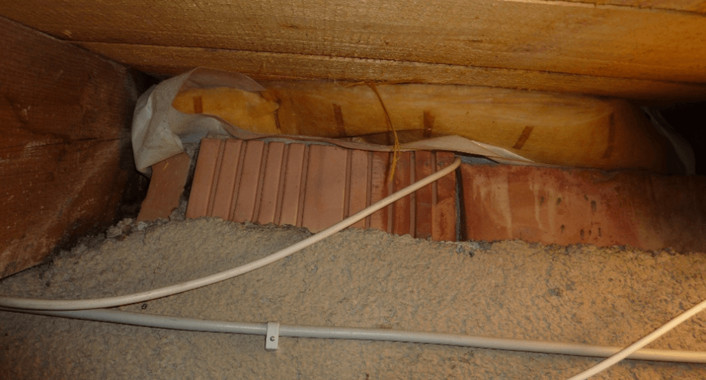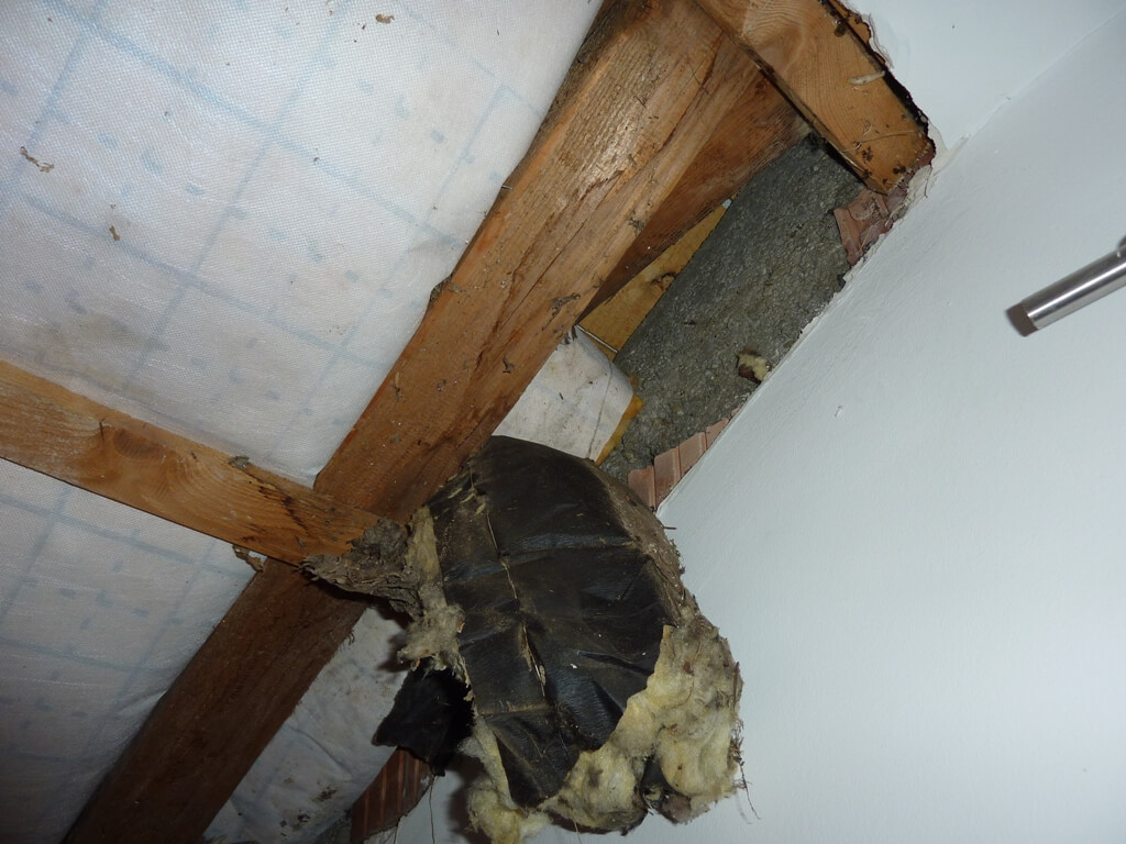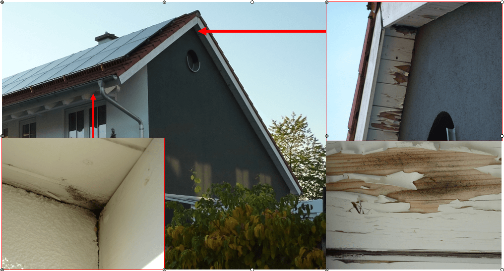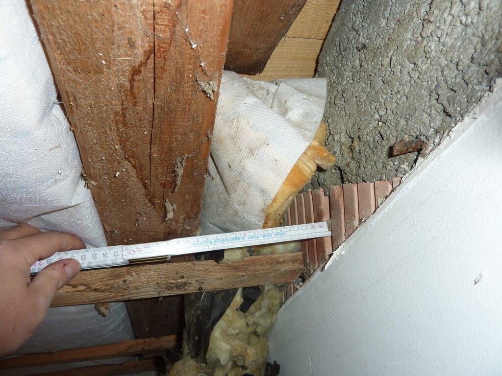 | Feststellungen: | Der fachgerechte Anschluss der Luftdichtheitsschicht fehlt an allen Mauerkronen, den Kehlbalken, den Dachflächenfenstern*, den Dunstrohren und dem Kamin. * siehe Rubrik Dachflächenfenster |