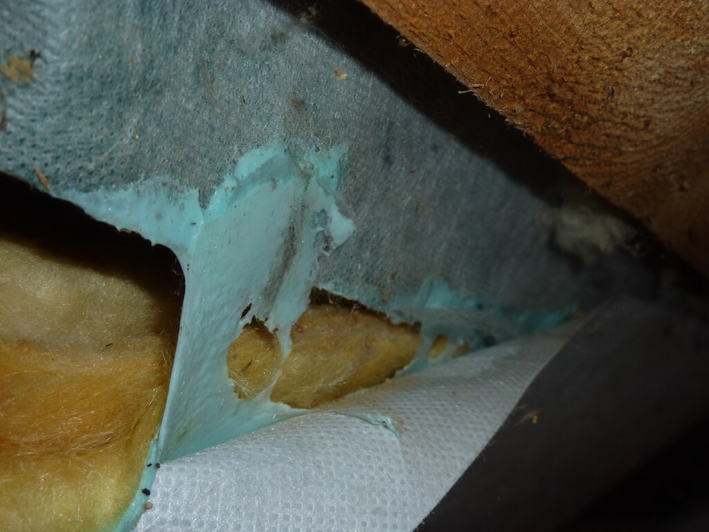 | Schadbild: | Die Verklebung der Luftdichtheitsschicht hatte sich gelöst. Im Zuge der Bauteilöffnungen stellte sich heraus, dass die Verklebungen, soweit vorhanden, nicht fachgerecht waren. Die Bahn erreichte die neuralgischen Bereiche nicht, oder wurde nur dekorativ eingelegt. Einige ungedämmte Bereiche und Fugen wurden sichtbar. Systemkomponenten wie |